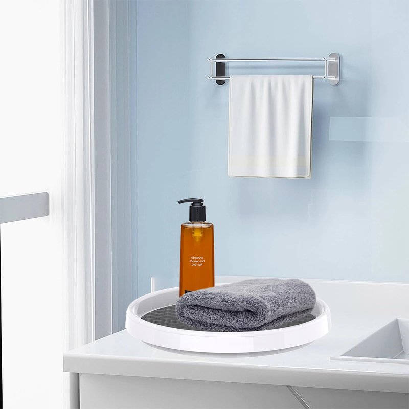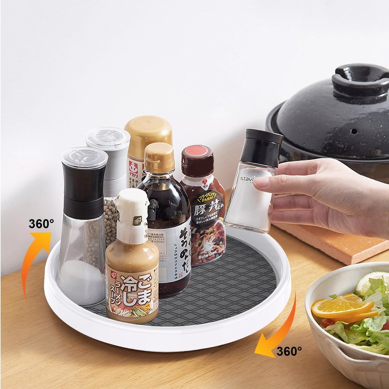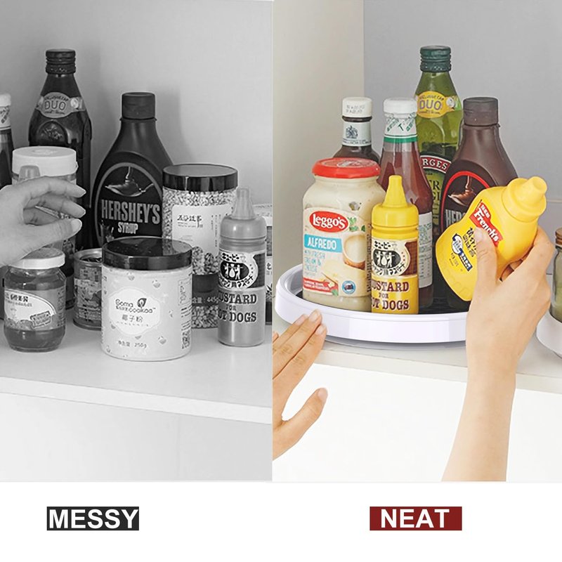 The lazy susan organizer provides organized, easy-access to hard-to-reach items. Turntables are outfitted with a Non-Skid liner, ensuring that items stay in place while spinning. The organizer features non-slip lining to keep items in their place and a wide base to ensure stability. Great for putting on table-tops, in fridges, in cabinets,bath room, laundry room,office home to help store and organize food items. Nice product for home storage