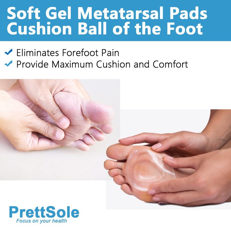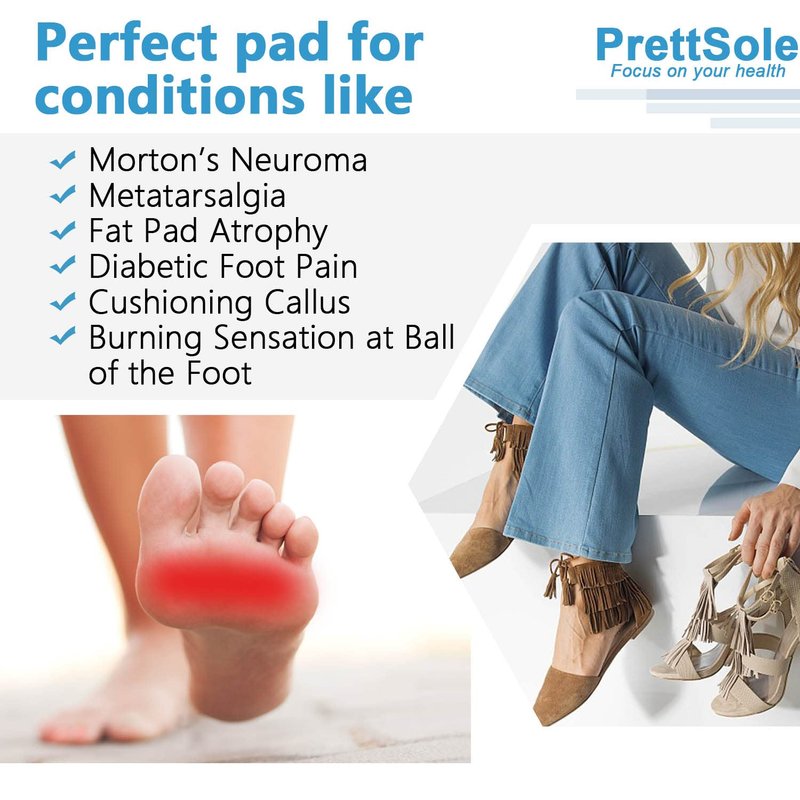 - RELIEVE METATARSAL PAIN -- If you suffer from ball of foot pain, using PrettSole Metatarsal Pads can help you deal with the problem. It cushions your ball of the feet and help relieve metatarsal foot pain caused by metatarsalgia, Morton’s neuroma, fat pad atrophy, burning sensations, diabetic foot pain and other front foot conditions.