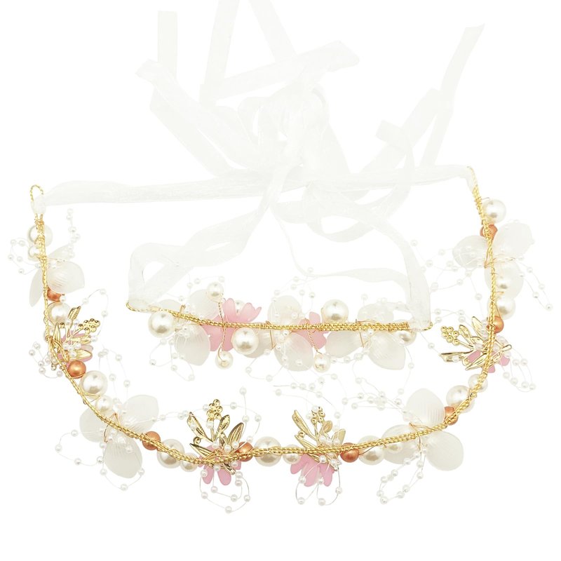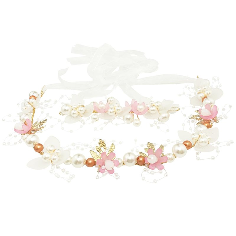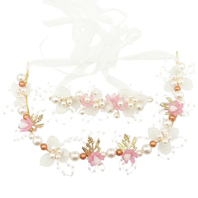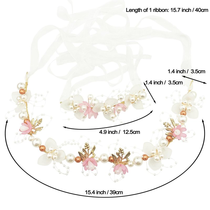 - 【Design】 The pearl flower wrist corsage hair piece set is hand wired by gold color alloy vine with gold color leaf / champagne gold & beige pearls / pink & translucent flower, 2 ends with white ribbon for tying and adjusting, shiny and add sparkle to your girl's hairstyle