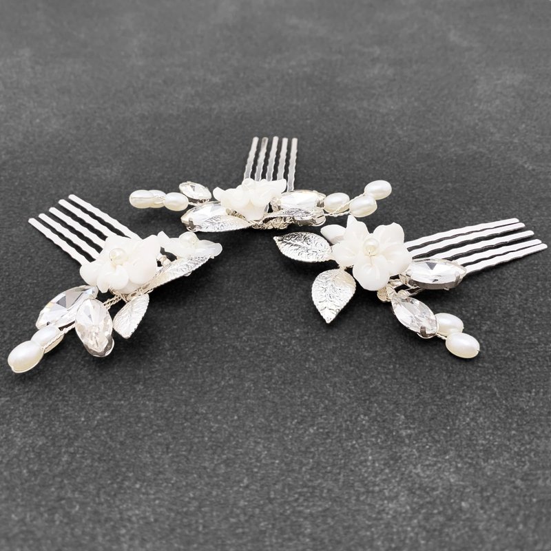PRETTYLIFE White Flower Hair Comb 3pcs Bridal Crystal Pearls Leaf Hair Pin Pieces Accessories for Wedding Party (Silver Leaf)
