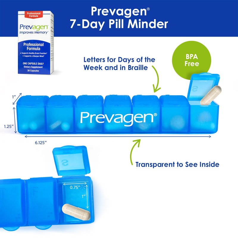 - Includes a Prevagen 7-day Pill Minder to help you stay organized. BPA free, letters & braille for days of the week