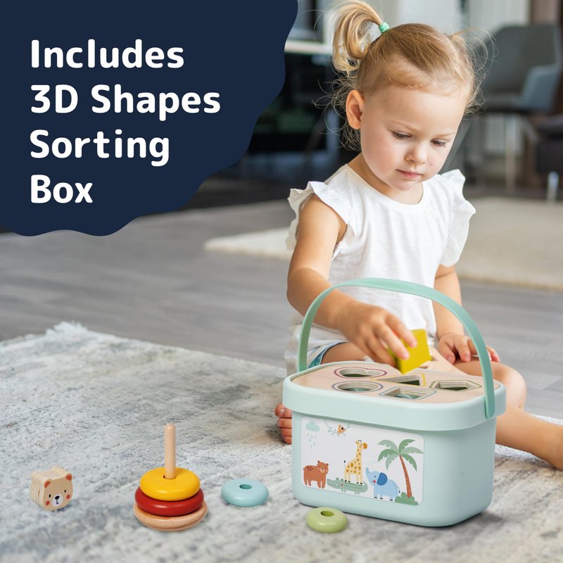 - SPARK IMAGINATION: Ignite your toddler's creativity with this montessori box, a stacking montessori toy set that includes a shape sorting box play kit (9Lx6.4Wx5 Inch), stacking rings with a bear, and a rolling elephant
