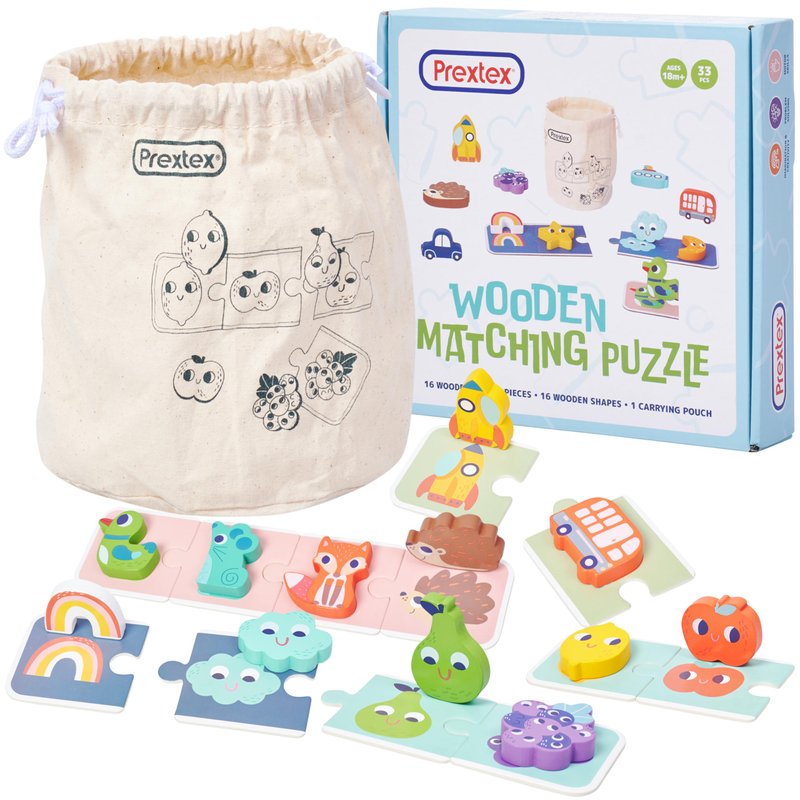 Unlock Fun & Learning with Prextex Wooden Matching Puzzles Introduce your child to a world of fun and learning with our Prextex Wooden Matching Puzzles. Designed to engage young minds, these puzzles help develop essential cognitive and fine motor skills in a playful manner. Why Choose Prextex Wooden Matching Puzzles? Cognitive Boost: Enhance problem-solving, spatial reasoning, critical thinking, and memory skills through engaging puzzle play. Fine Motor Skills Development: Strengthen hand muscles and improve dexterity with each puzzle piece your child grasps and manipulates. Hand-Eye Coordination: Promote visual guidance and precise hand movements, crucial for future tasks like writing and drawing. Product Features: 16 wooden puzzle pieces 16 wooden shapes 1 convenient carrying pouch Total of 33 pieces Suitable for ages 18 months and older Packaging dimensions: 8.8 x 9 x 1.8 inches Crafted from wood, our puzzles are durable and safe for young children. The included carrying pouch makes it easy to take this educational toy on the go, ensuring your child can enjoy fun and learning anywhere. Help your child develop essential skills while having fun with Prextex Wooden Matching Puzzles. This wooden matching game is ideal for enhancing your child's cognitive abilities and fine motor skills. The wooden shapes toy encourages precise hand movements and hand-eye coordination. It’s an ideal montessori learning toy that promotes exploration and curiosity. The shape matching game is ideal for improving recognition abilities and problem-solving skills. It also serves as a color matching toy, enhancing memory and critical thinking. The packaging dimensions are 8.8 x 9 x 1.8 inches, making it easy to carry and store. Suitable for ages 18 months and older, this matching puzzle game ensures hours of educational fun.