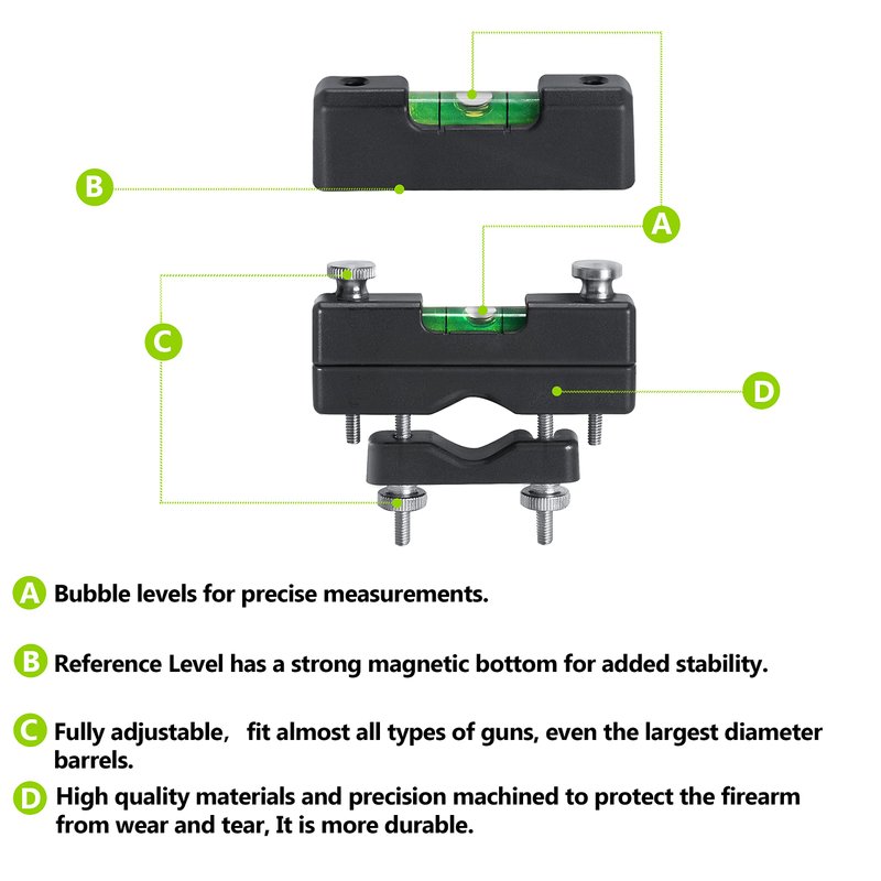 - 【Highly Accurate】 Each scope leveling tool has a bubble level, both on scope turret level and gun clamp level. They are precision calibrated at the factory and work with your gun stand to ensure perfect alignment between your firearm and its optics.