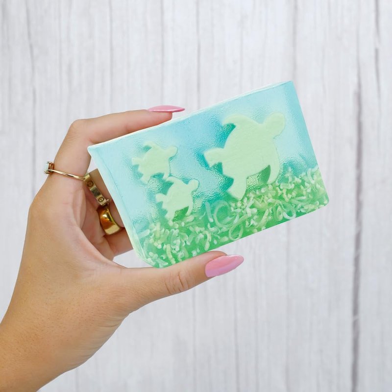 A family of sea turtles swimming in a coconut lime lagoon. Our glycerin soaps are devoid of alcohol and other harmful chemical substances that might irritate your skin. Our soap contains over 25% vegetable glycerin, which helps lock your skin’s natural moisture and keeps it from drying.