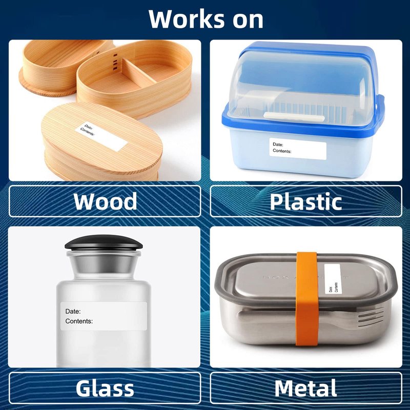 - š„ćMultipurposećFreezer food labels stick to glass jars, metal bowl, wood containers, plastic bags and more.