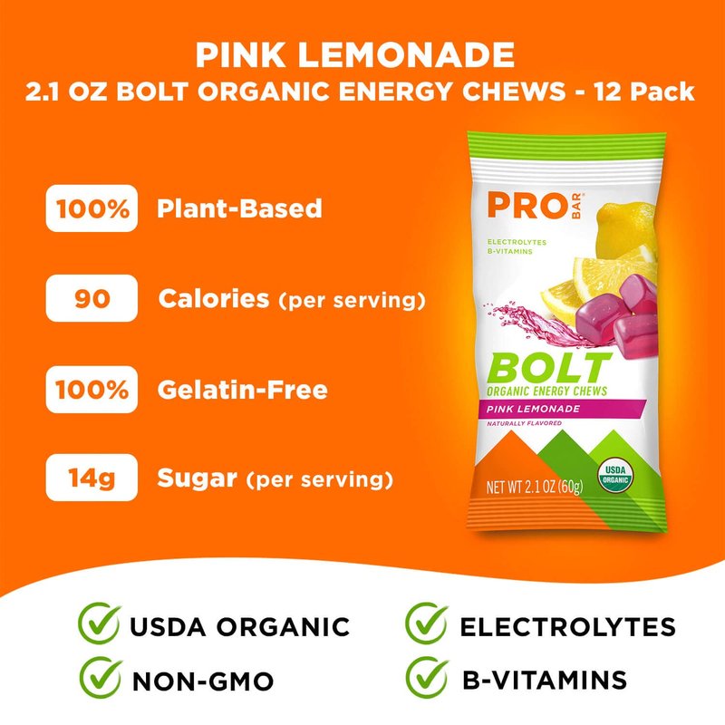 PROBAR - BOLT Organic Energy Chews, Pink Lemonade, Non-GMO, Gluten-Free, USDA Certified Organic, Healthy, Natural Energy, Fast Fuel Gummies with Vitamins B & C (12 Count)