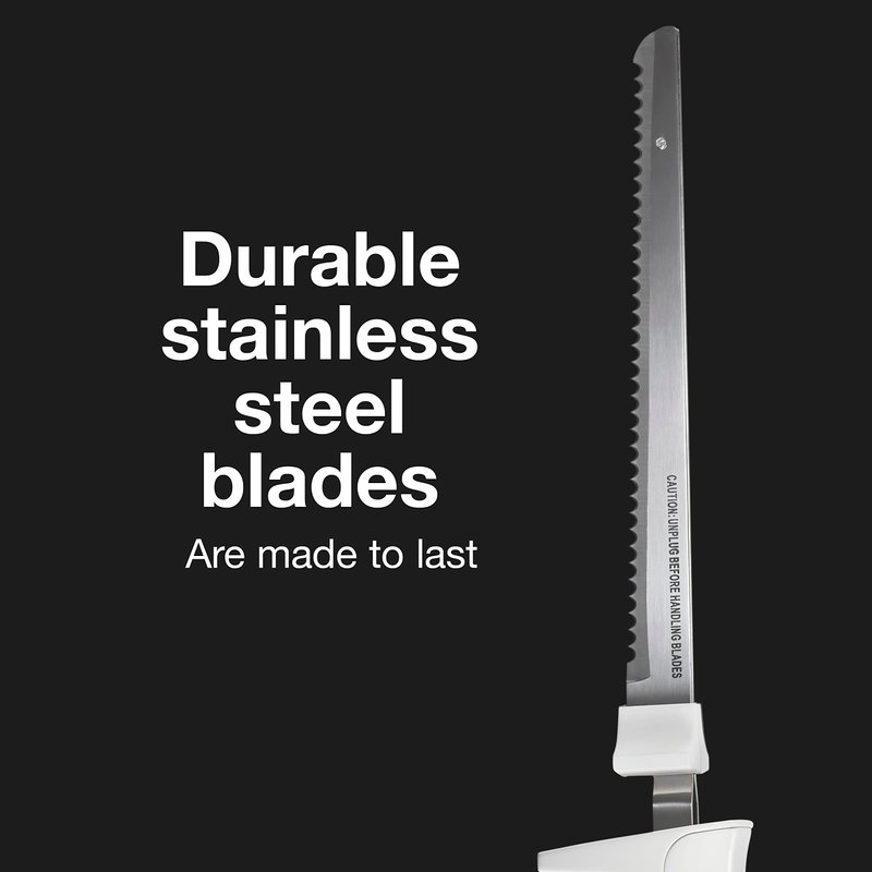 - SLICE QUICKLY & EVENLY: The electric carving knife's powerful 120 watt motor and reciprocating stainless steel blades with serrated edge give you the precision and control to cut quickly and evenly every time you slice.