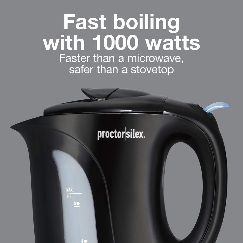 Proctor Silex Electric Tea Kettle, Water Boiler & Heater Auto-Shutoff & Boil-Dry Protection, 1000 Watts for Fast Boiling, 1 Liter, Black (K2071PS)
