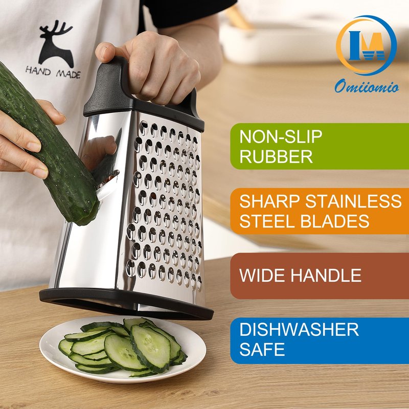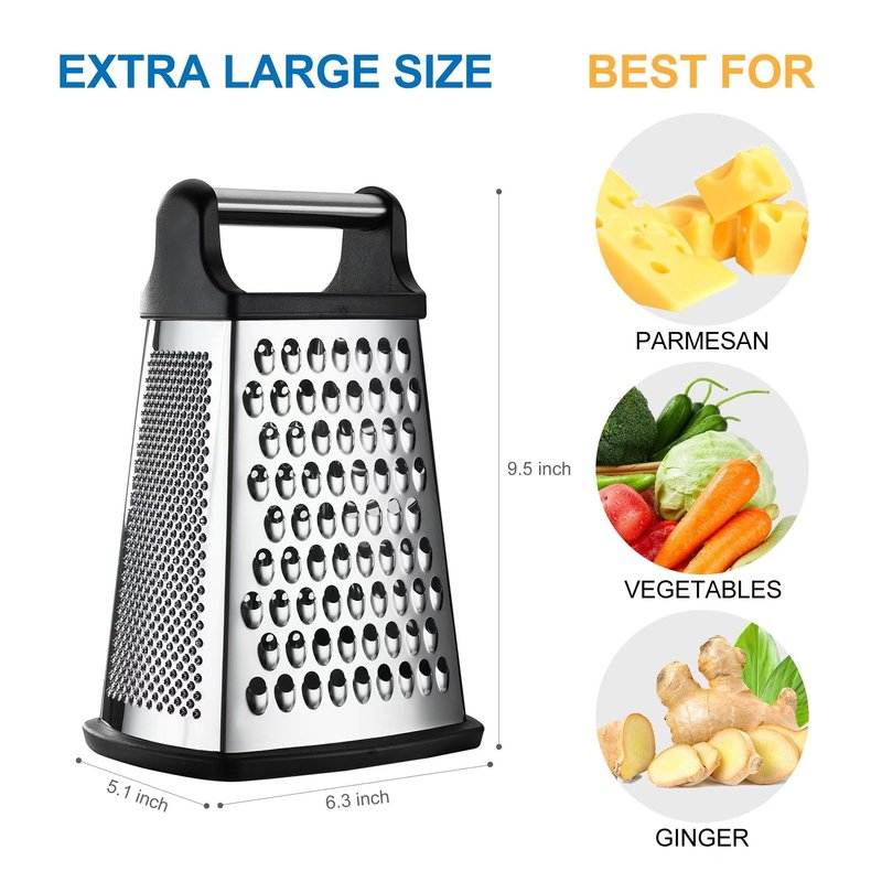 - Incredible Versatility With The 4 Sided Design: Consider getting rid of all the other graters and slicers you may own to make room for this. Coarse grating, Medium grating, Fine grating/Zester and even a Slicer - all in one convenient tool. Quickly prep an array of foods like cheese, potato, squash, zucchini, carrots, lemons and cucumbers. Multi-functional with a comfortable handle that gives you total control.