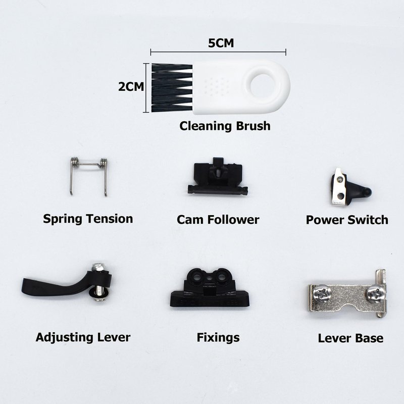 - Package comes with adjusting lever, power switch, spring tension, cam follower, lever base, latch plate, small cleaning brush each 1 piece, and 2 pieces screws for lever base