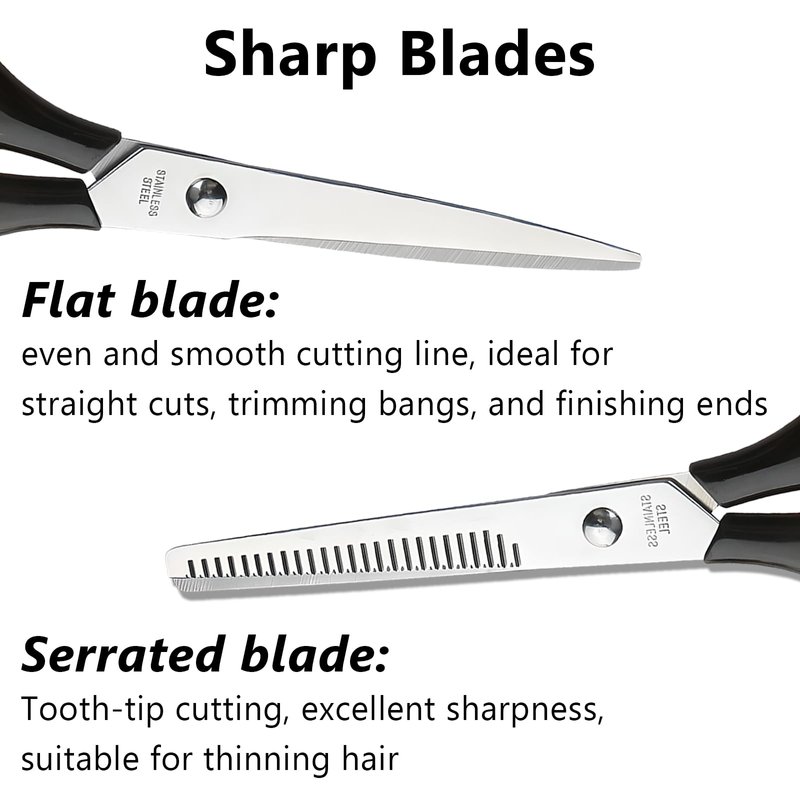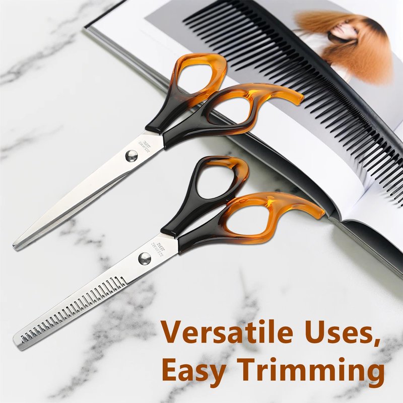 Crafted from 100% Japanese stainless steel, the Jaasuee Professional Hairdressing Scissors feature hand-sharpened thinning and razor edges for precise, effortless trimming of hair without causing damage or split ends. This right-handed scissors kit is meticulously designed for sharp, precise cuts, enhancing your hairdressing experience. With a focus on superior quality and durability, each pair promises a clean cut and is ideal for professional salon use, home styling, and barbers.The kit includes a pair of hair cutting scissors and thinning shears, each tailored to create versatile, stylish looks. The thinning scissors boast about 30 teeth and offer a 20-25% thinning rate, perfect for texturizing thick hair or adding layers. An offset grip design minimizes thumb and wrist motion, providing comfort and reducing strain during extended use. This ergonomic design supports professional barbers and salon workers, ensuring maximum precision with minimal effort.