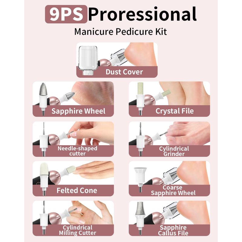 - What you will get: The Electric Nail Drill Kit comes with 9 interchangeable drill bits,100 sanding bands , dust shield and Type-C charging cable to give your nails a salon-worthy look, this nail kits are the best gift for your nail lovers friends, It's so convenient and you can do a hand or foot care salon privately at home, and everything you need is included.