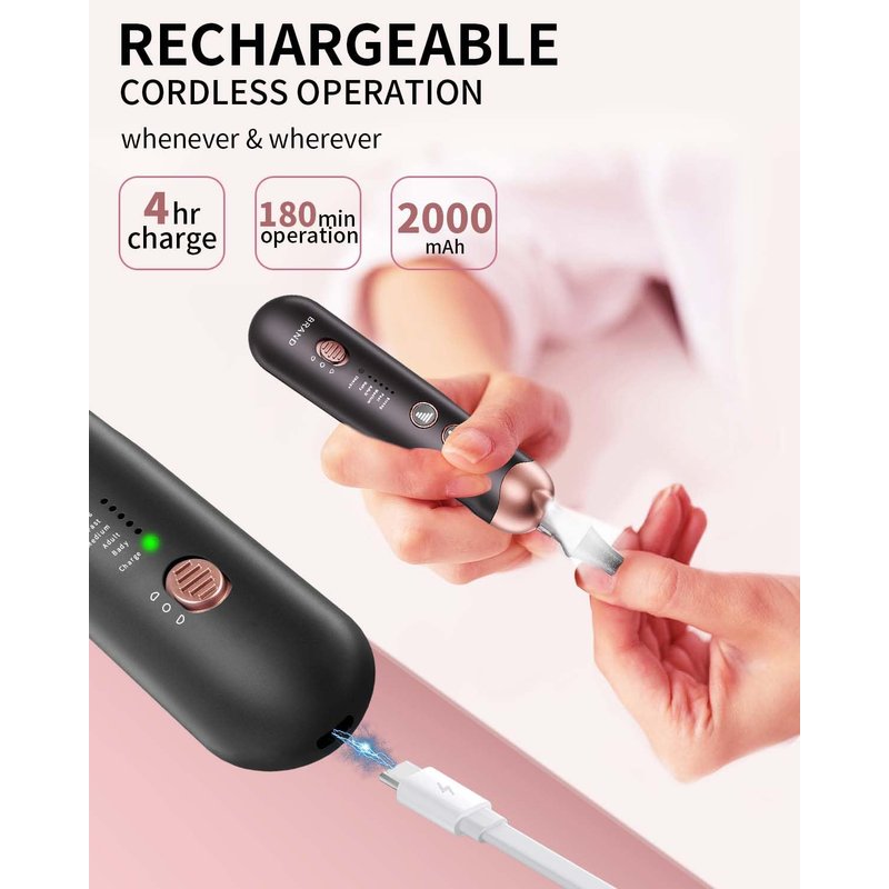 - RECHARGEABLE Nail File : With a large battery capacity (2000mAh) battery, you can use this Electric nail drill machine to do hand and foot care at anywhere anytime. Type C USB Cable included , Being fully charged this for about 4hours, the electric nail file will work up to 3 hours.
