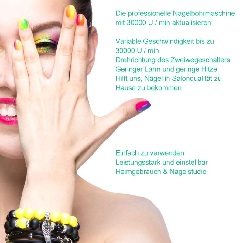 - HEAVY DUTY AND POWERFUL NAIL DRILL MACHINE - The nail drill handpiece is made of aluminum alloy. It’s designed with heat emission hole, which would creat less heat for long time operation, you won't feel hand fautigue. Low noise and low vibration, max speed is up to 30000rpm, it also works well with acrylic, gel and extension art nails, hard and thick nails. It’s suitable for home personal use and salon. Pink, grey and black for options.