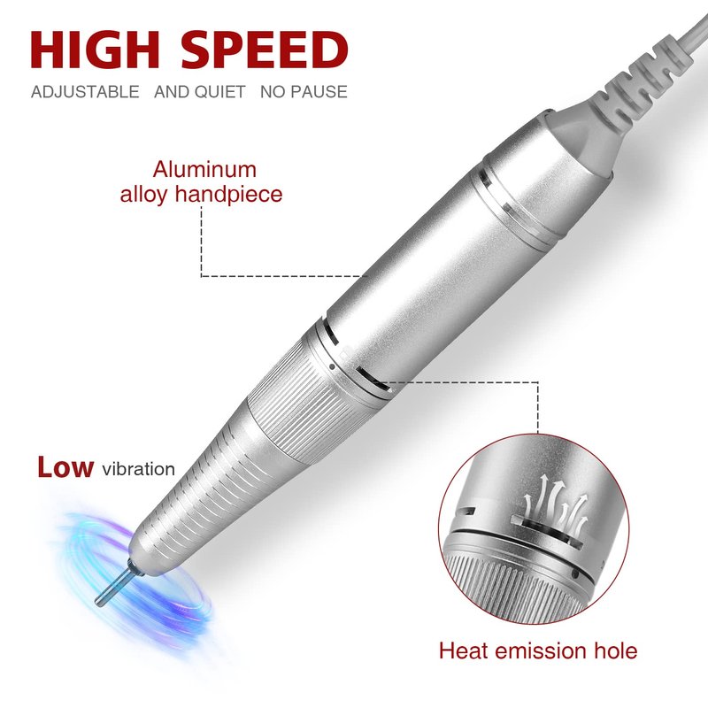 The newly designed LCD mini-type nail grinding machine, the LCD speed and battery are clear at a glance, so it will avoid the sudden power-off phenomenon during work; the appearance is exquisite, the ultra-bright aluminum metal body, the handle has its own switch, safe and convenient, LOW NOISE / SAFETY / HIGH SPEED, stable and shockless, it is definitely a great gift choice for yourself or your friends. This electric nail file can be used for manicuring, pedicuring, removing calluses, beautify pet's nail and so on, easy to remove all kinds of phototherapy nails, crystal armor, remove the nail piece fastly, suitable for professional nail technician or personal nail art or Manicure/pedicure using. ABOUT PRODUCT ADVANTAGES: ※ Professional imported ball bearings and a fast motor, ※ New Upgraded LED display: Could see that 0-30000rpm and 4 grid battery display, adjustable speed. ※ Professional imported ball bearings and a fast motor. ※ Low Heat: Great aluminum body and self-contained heat emission hole for efficient heat dissipation. ※ Quiet & Safe: Smooth operation and low vibration; Handle has a safety lock(lock the bit, safe and compact). ※ Fashion & Portable: wireless design and easy to move. ※ Support for output voltage 100-240V/50-60Hz, Available in multiple countries. ※ Easy to operate and specialized for carving, engraving, grinding, sharpening, sanding, polishing, drilling, to remove dead skin, to solve barbed etc, it also be used for grinding pet nails. SPECIFICATIONS: Input Voltage Range: AC100-240V/50-60Hz Output Voltage DC24V 1A Battery capacity: 2000mA(11.1V) Charging Time: About 2 houes Battery life at full speed: 10 hours Speed: MAX 30000RPM WHAT'S IN BOX: 1 x electric nail drill 1 x handpiece seat 1 x AC adaptor 1 x handpiece holder 6 x drill bits 1 x user manual