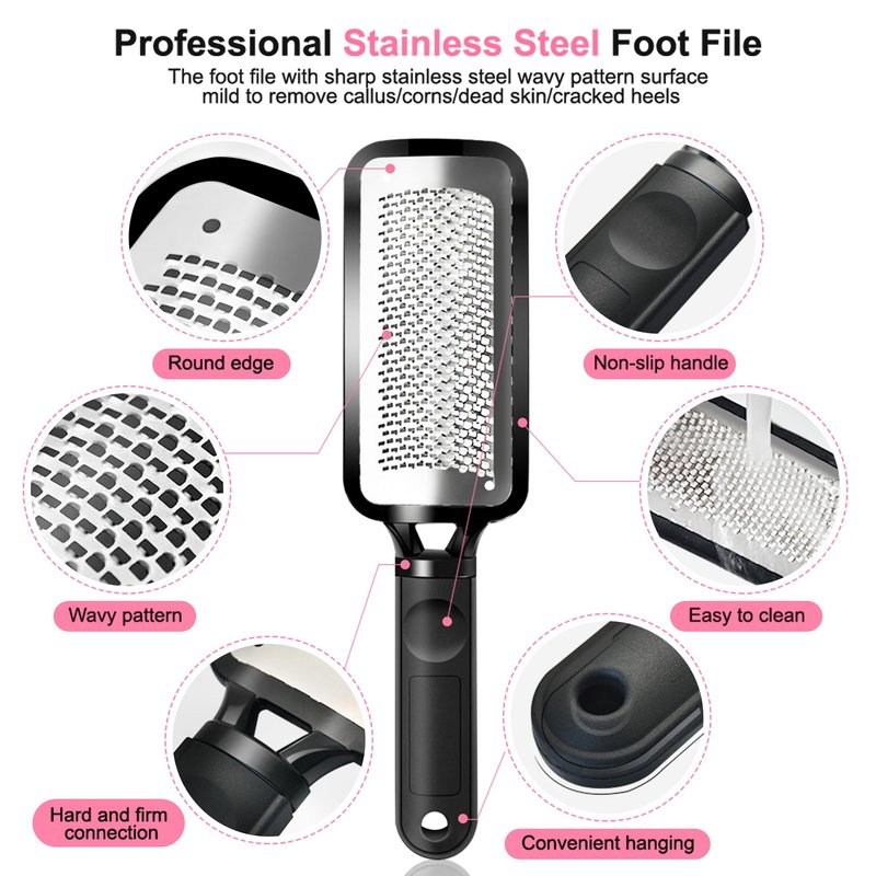 - 1Pc Heel Scraper for Feet: The colossal foot rasp with sharp stainless steel wavy pattern surface mild to remove callus/corns/dead skin/cracked heels, can be gently curved for use at any angle, smooth your feet, premium stainless steel foot file with anti rust and water proof features ensure the foot exfoliator can be used on dry or wet feet surface, washable and reusable, non-slip design ensure you can grip the foot file, and the hanging holes easy to save, professional pedicure foot file for nail salon or home use.