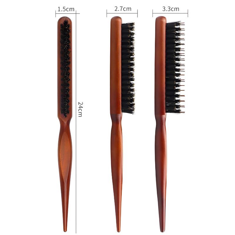 Introducing our exquisite Triple-Row Teasing Comb, crafted for both professional and personal use. Made with the finest boar bristles and nylon teeth, set in a robust beechwood handle, this comb not only provides an unmatched styling experience but also preserves the health of your hair. Its natural wooden color adds an elegant charm.