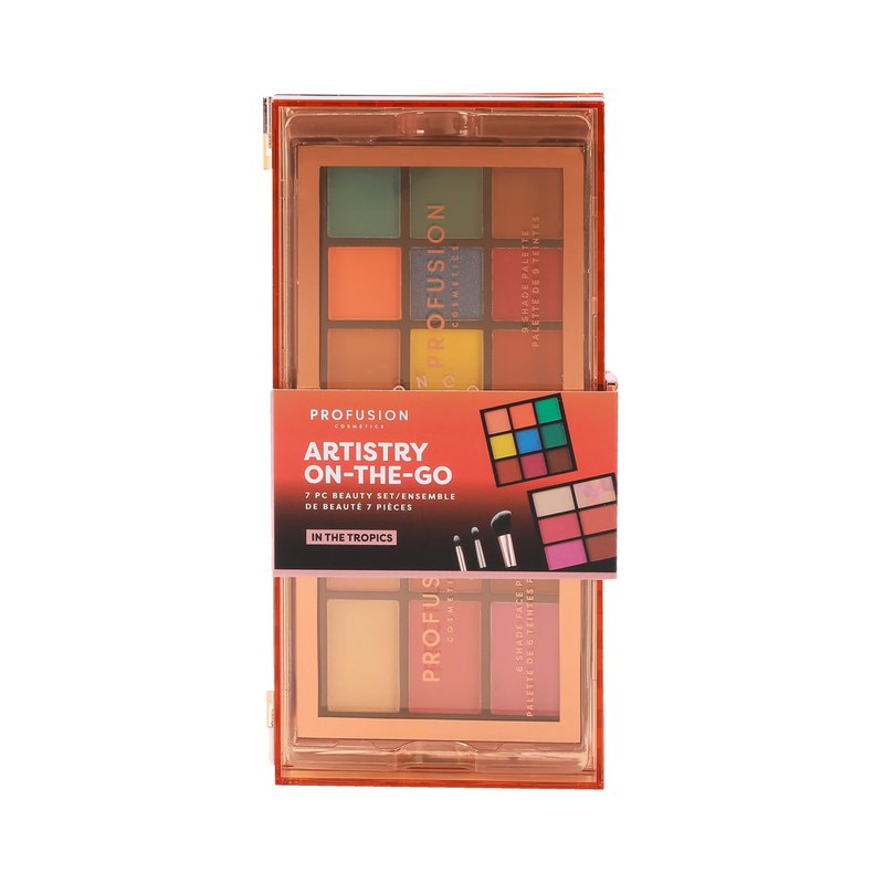 Profusion Cosmetics Artistry On The Go Makeup Kit, 9 Shade Eyeshadow and 6 Shade Face Palettes, 2 Eyeshadow and 1 Face Brush, 1 Face and Eye Primer (In The Tropics, 1)
