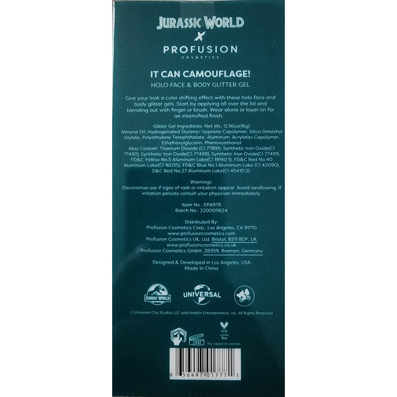 The Profusion Cosmetics Jurassic It Can Camouflage Holo Face and Body Glitter Gel is your go-to for adding dazzling sparkle to any look. Its holographic glitter creates a stunning color-shifting effect that changes with your movement, giving you a unique and eye-catching finish. You can easily build the glitter from a subtle shimmer to a bold shine, ideal for any event. The gel dries quickly and stays put all day or night without smudging, while its lightweight, non-sticky formula ensures you stay comfortable. Application is a breeze, just use your fingers or a brush, and it removes easily with makeup remover or soap and water. Flawless for festivals, parties, or any time you want to stand out.