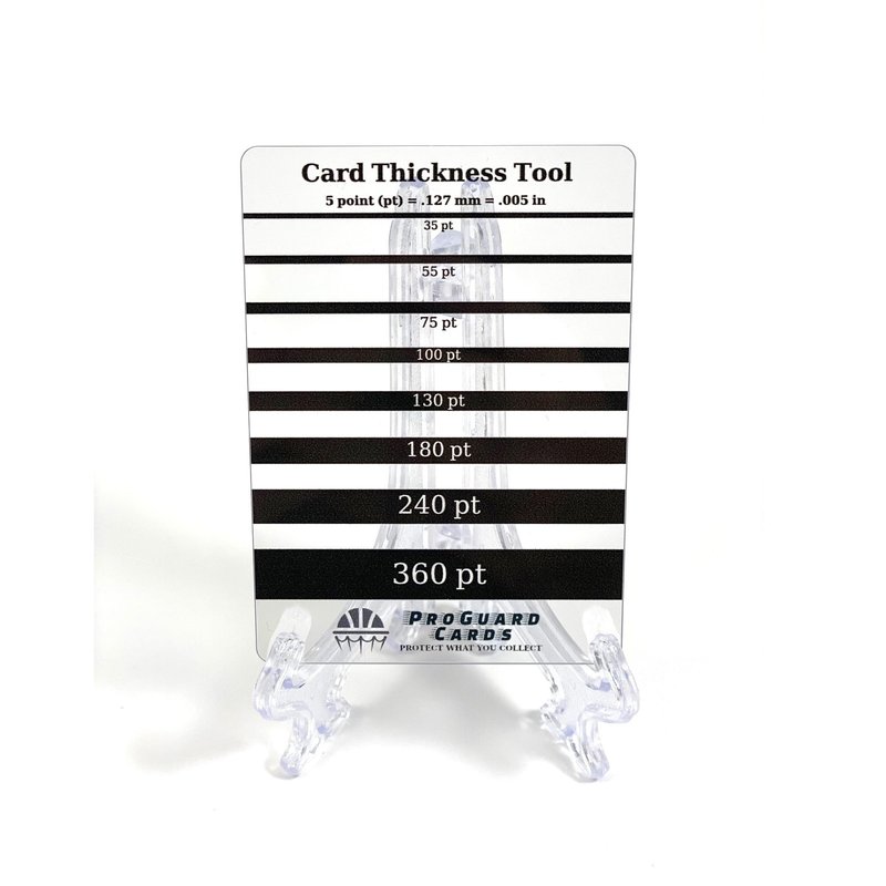 ProGuard Cards Trading & Sports Card Thickness Guage Tool Guide. Leave the guessing out of it. Clear material for easy use. Durable plastic that lasts. Fits in standard penny sleeves for storing and protecting.
