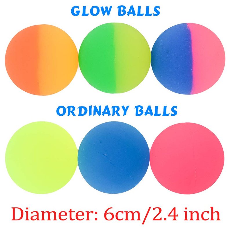 - WHAT YOU WILL GET: 6 bouncing balls (3 bi-color glow in the dark balls & 3 pure color ordinary balls ). 2.3"(60mm) in diameter. Made of high quality rubber. Non-toxic and odorless.