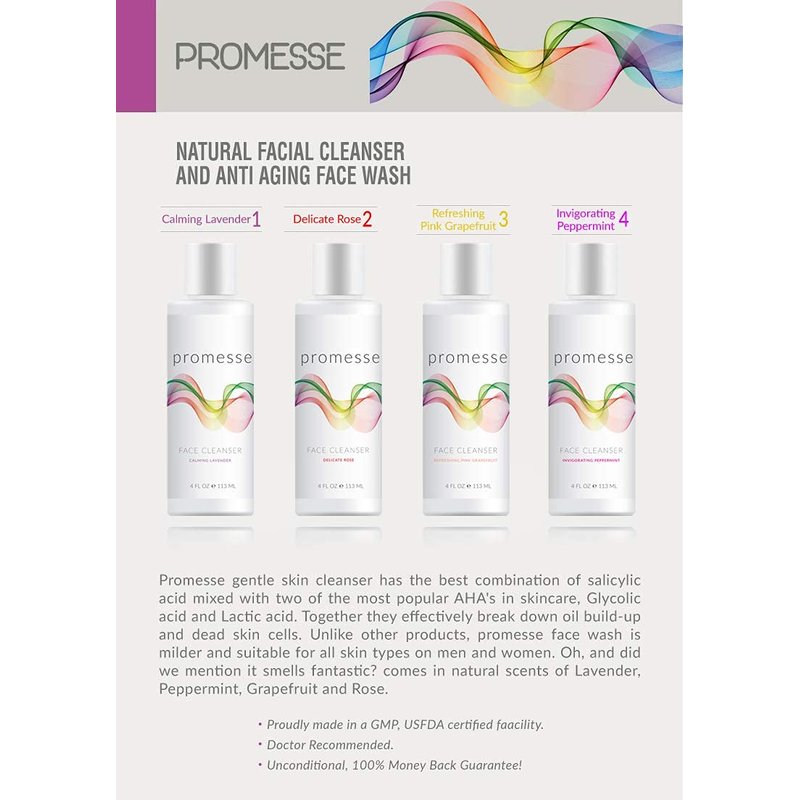 PROMESSE gentle facial cleanser is a balanced formula with the gentle combination of glycolic acid, salicylic acid, and lactic acid working together to rejuvenate the skin. Unlike other cream cleansers, gel cleansers, peels, and washes with harsh ingredients, this gentle cleanser naturally cleanses and clarifies the skin, effectively removing dirt, excess oil, makeup and clearing dead skin cells on the face and body. It helps reduce and prevent the appearance of wrinkles, dark spots, fine lines, blemishes and other signs of aging and leaves your skin feeling brand new without experiencing redness, soreness or peeling. While adding all the benefits of deep cleansing, PROMESSE gentle face wash leaves your skin feeling clean, bright, and moisturized for a more healthy complexion.