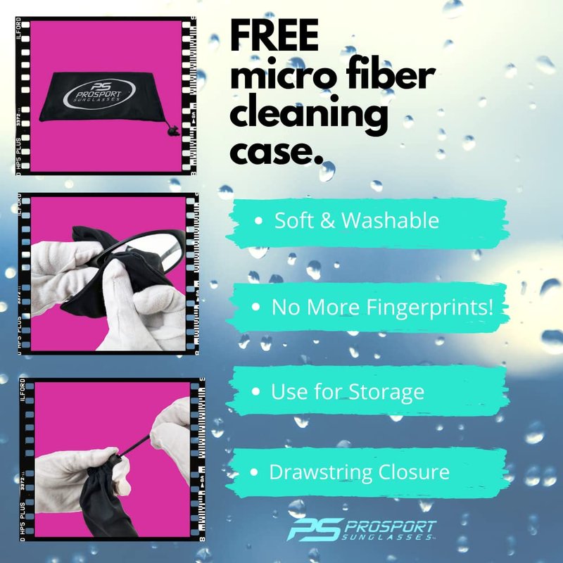 - FREE PROSPORT LOGO MICROFIBER CLEANING POUCH: While the sunglasses are in the pouch, simply rub the lenses with the soft microfiber to wipe off fingerprints, smudges and water marks. Take the sunglasses out and they are nice & shiny. Drawstring with tightening closures keeps the glasses secure inside.