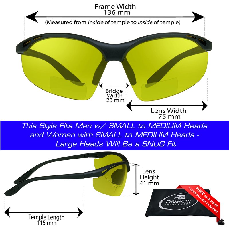 Bifocal Reading powers are available in +1.50, +2.00, +2.50, +3.00. Fit Small to Medium head sizes. Free microfiber cleaning case is included for each pair.
