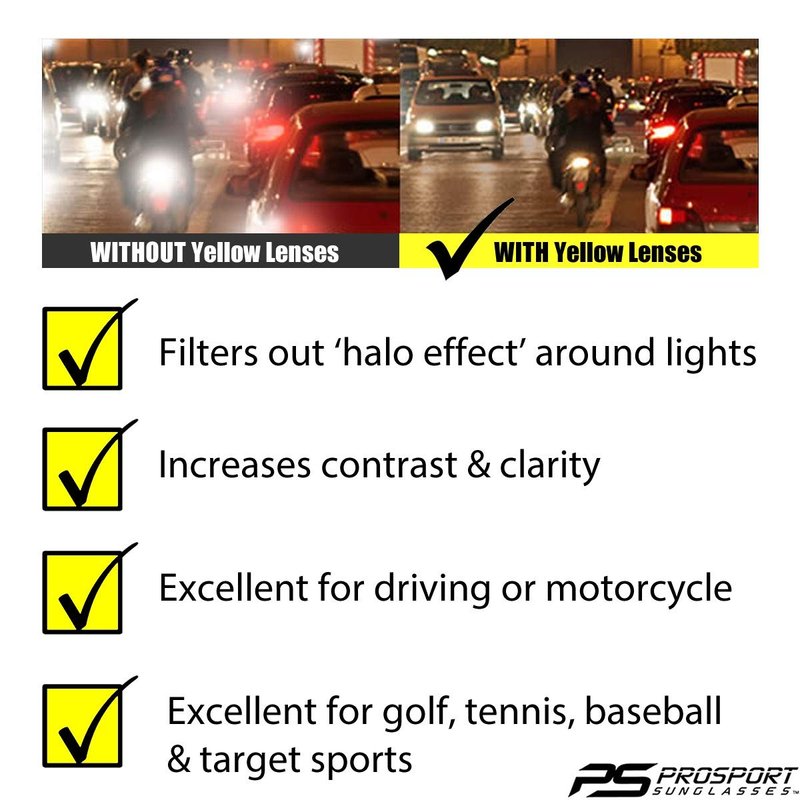 - YELLOW NIGHT VISION LENSES: Yellow lenses reduce the halo effect around lights at night. They also enhance colors at night and sharpen vision. You will often find Shooting glasses with yellow lenses to help increase contrast and clarity. Yellow glasses are excellent for motorcycle riding and cycling at night