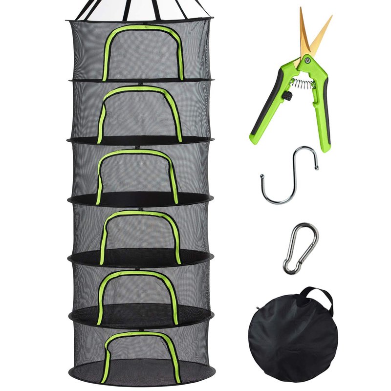 PROTITOUS 6 Tier Black Mesh Zippered Herb Drying Rack Hanging Dryer Dry Net with Pruning Shear for Hydroponics