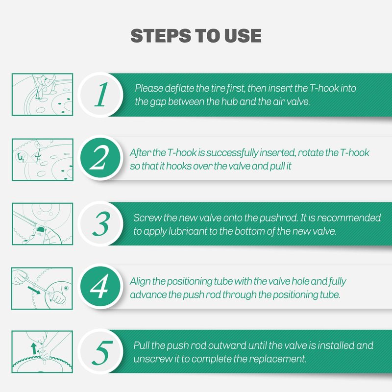 - ★【How to Use】 1-Please deflate the tire first, then insert the T-hook into the gap between the hub and the valve. 2-After the T-hook is inserted, rotate the T-hook so that it hooks over the valve and pull it outward. 3-Screw the new valve onto the pushrod.Apply lubricant to the bottom of the new valve. 4-Align the positioning tube with the valve hole and fully advance the push rod through the positioning tube. 5-Pull the pushrod outward until the valve is installed and unscrew it.