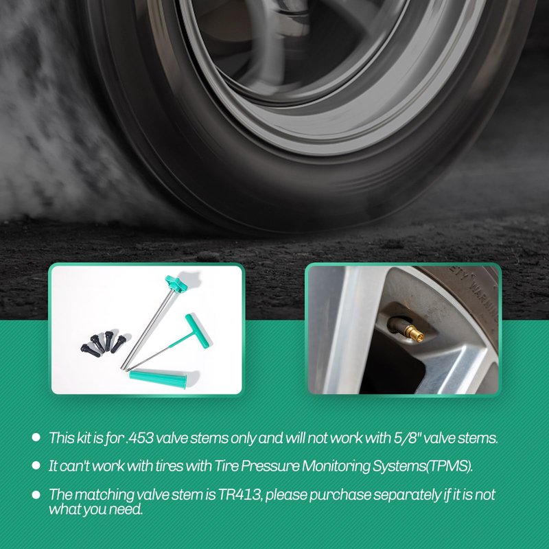 - ★【Universal But Attention】This kit is for .453 valve stems only and will not work with 5/8" valve stems and will not work with tires with Tire Pressure Monitoring Systems(TPMS). The kit comes with 4PCS TR413 valve stems, so if that's what you need, you don't have to repurchase the stems.