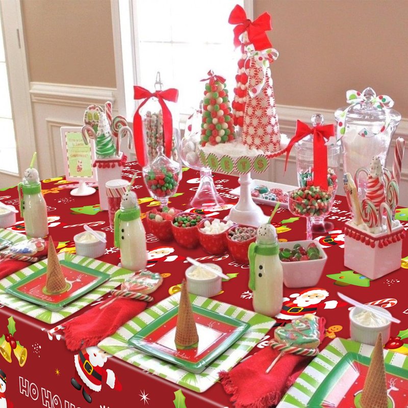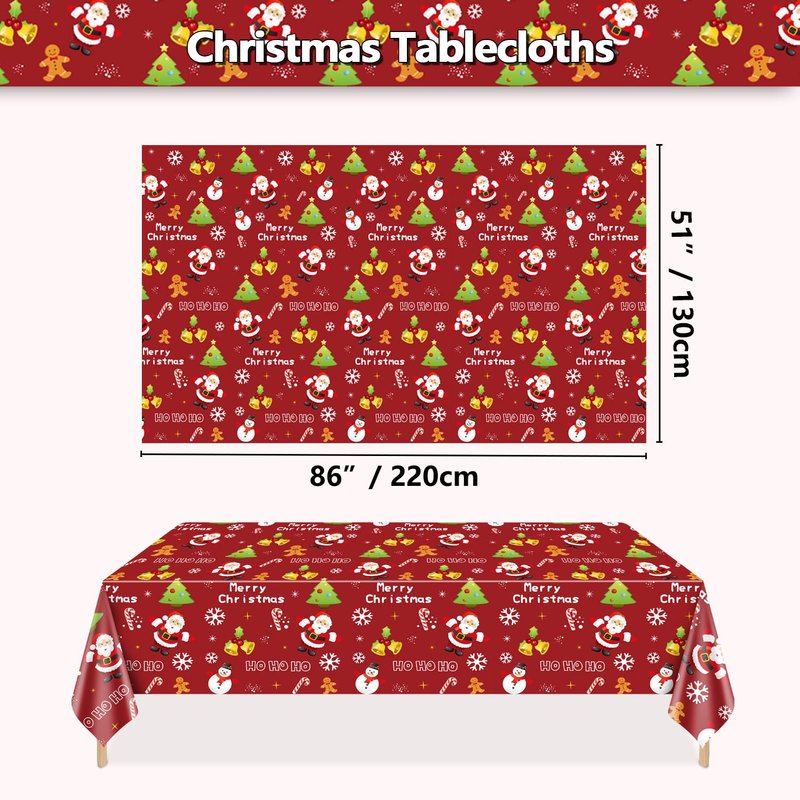 - Classic Christmas Decorations: Our Christmas party tablecloths contain Santa Claus, Christmas snowmen, Christmas trees, snowflakes and other Christmas elements.red table cloth making your Christmas time more festive and memorable
