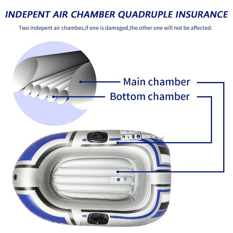 - 2 independent air chambers for safety; oar locks on both sides; grab the rope to dock.