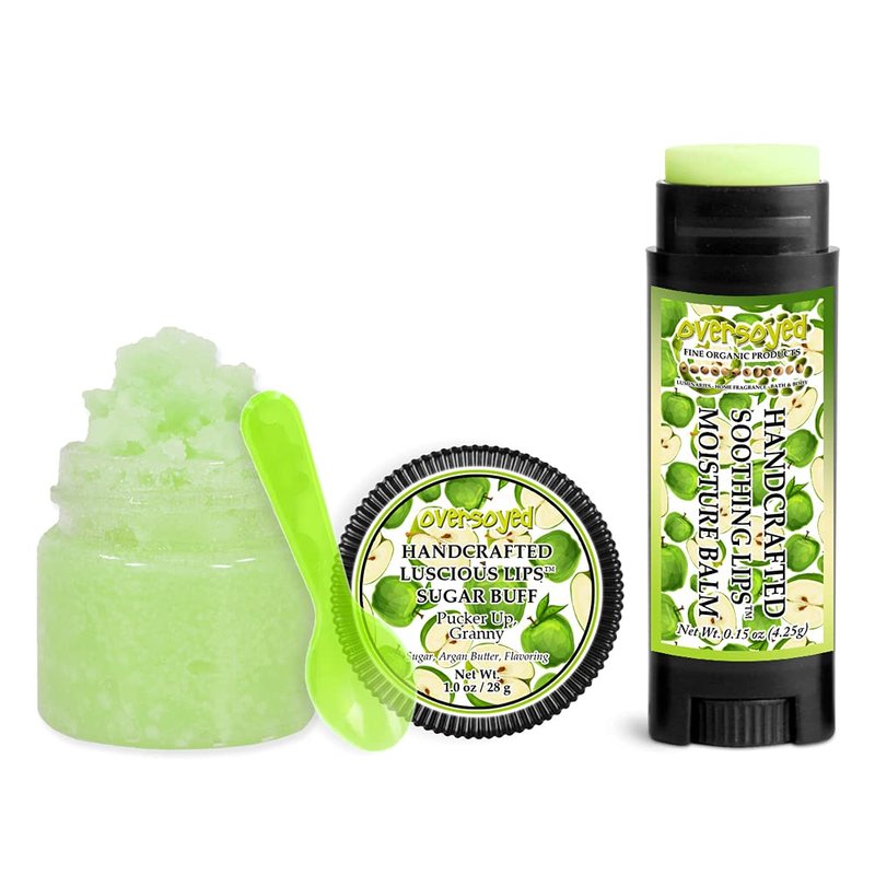 Pucker Up, Granny Soothing & Luscious Lips by OverSoyed Exfoliator & Chapped Lip Repair Lip Care Combo | Artisan Handcrafted to Order Sweet Green Apple Citrus Pear Floral Sugary Flavored Exfoliating Sugar Lip Scrub & Lip Moisturizer Balm Gift Set
