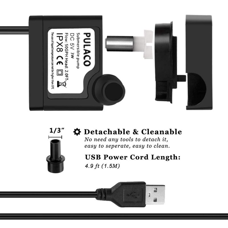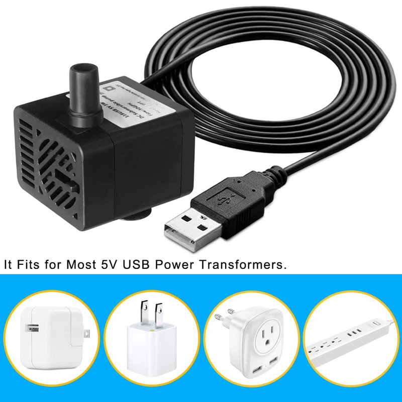 - ★ Safety USB power cord: This Water Pump is USB DC 5V 3W Power. Flow Rate 50 GPH. its most advantage is that it does not have the risk of accidentally injurying a person or pet by leaking electricity.