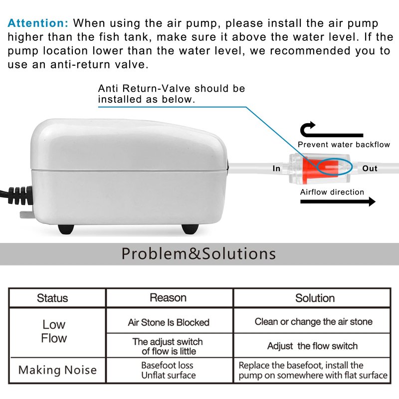- ★【SATISFACTION GUARANTEED】Our Aquarium air pump is built with durability in mind and safety for every design. In the remote possibility that you’re not satisfied with our product, just contact us, and we will gladly give you a new Aquarium air pump replacement. 12 Month Warranty and 24 Hour Professional After-sales Service.