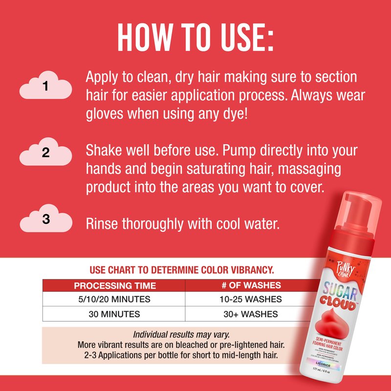 For those seeking a quick burst of boldness, a mere 5 to 10 minutes of processing time results in vivid, eye-catching hues that last for 10 to 25 washes. Ideal for the spontaneous and adventurous, this option provides a temporary yet impactful transformation.For the true color enthusiasts, a 30-minute processing time unleashes the full potential of Punky Sugar Cloud Licorice, delivering a rich, intense outcome that endures for 30 washes or more. This extended processing time guarantees a show-stopping, long-lasting color that allows you to express your individuality with confidence. Punky Sugar Cloud Licorice is not just a hair color; it's a customizable canvas for your self-expression. Enjoy the freedom to curate your ideal look, confident that our formula seamlessly adapts to your preferences, making every application a personalized and transformative experience.