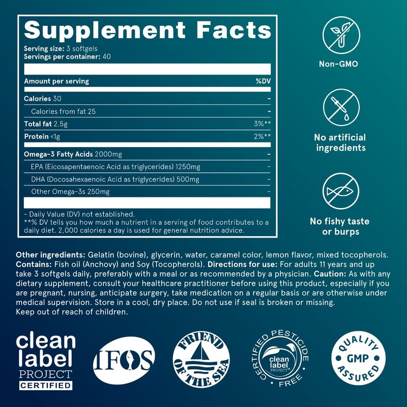 Puori - O3 Ultra Pure Omega 3 Fish Oil for Heart, Brain & Eye Health, Inflammation - Burpless, IFOS Certified, Non-GMO, 2000mg EPA 1250mg DHA 500mg, 240 Softgel