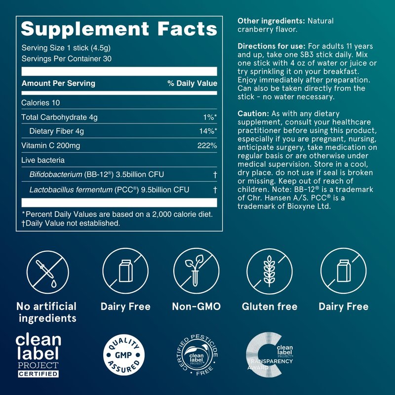 - ACTIVE PROBIOTIC BACTERIA: Every SB3 stick contains 13 billion active probiotic bacteria, 200mg of Vitamin C, 4g of prebiotic dietary fiber with a natural cranberries flavor.