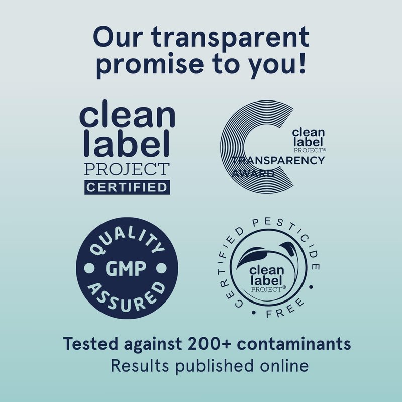 - FULL TRANSPARENCY: Every batch of every product tested for purity and potency by Clean Label Project. They use independent laboratories and publish the test results for everyone to see.