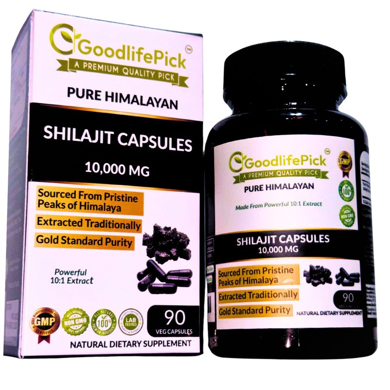 Goodlife Pick Himalayan Shilajit Capsules are made from pure, natural Shilajit resin that is sourced from the untouched Himalayan heights. The capsules are carefully extracted using traditional methods to ensure maximum potency and preserve the natural ingredients. GoodlifePick shilajit pure himalayan organic is a powerful natural supplement that has been used for centuries to capsule promote overall health and well-being. It is rich in essential trace minerals, humic acid, fulvic acid, and natural antioxidants, which can help to support the body's natural functions, boost energy levels, and improve cognitive function. The capsules are easy to take and can be taken with warm milk , water or tea. GoodlifePick Pure Shilajit capsules and Shilajit supplements are suitable for both men and women and are free from any artificial additives or preservatives. Goodlife Pick Himalayan Shilajit Capsules are a great way to support your health and wellness goals.