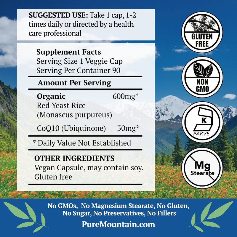 Pure Mountain Botanicals Red Yeast Rice with CoQ10 90 Kosher Vegan Capsules Now with 600mg Organic Red Rice Yeast Plus Co Q 10