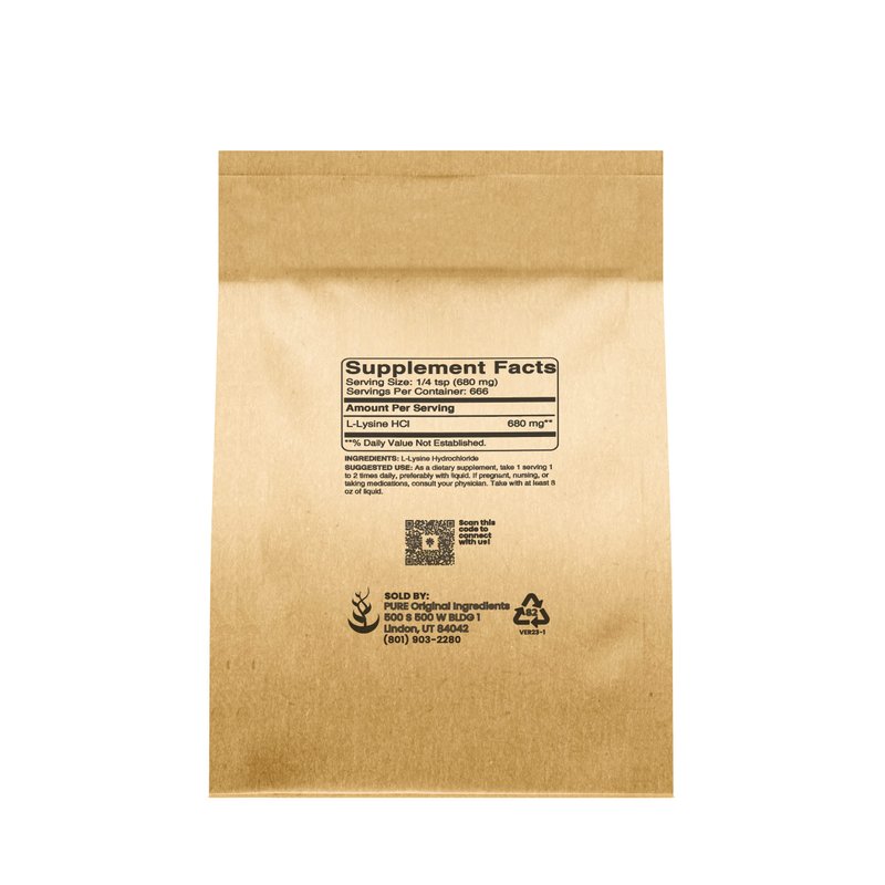 - Pure Original Ingredients L-Lysine Hydrochloride Powder is made from a single ingredient, providing a pure undiluted supplement
