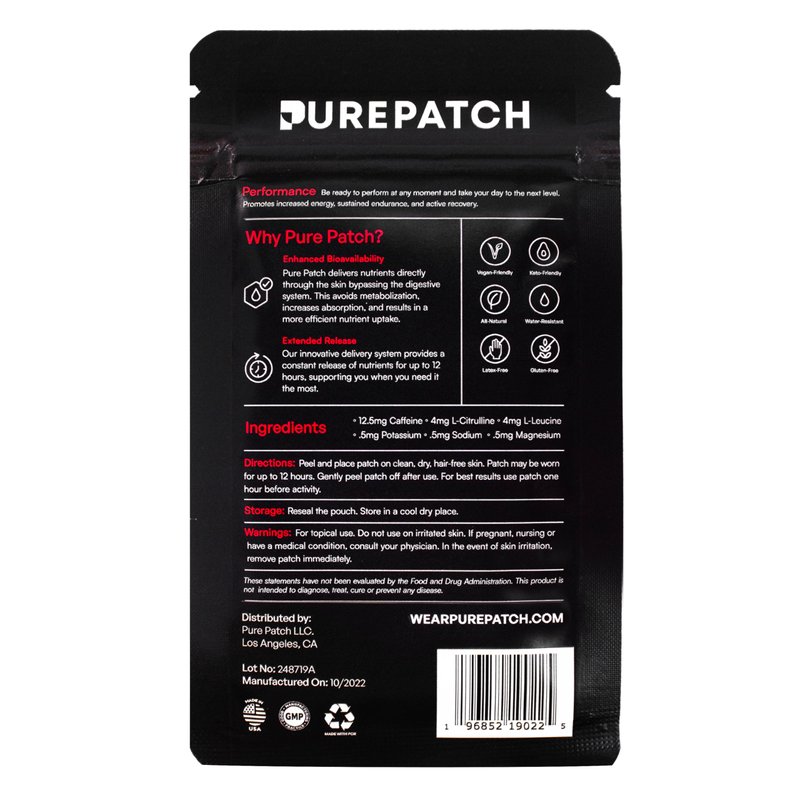 Pure Patch is a wearable, topical nutrition patch that delivers nutrients directly through the skin, bypassing the digestive system. This avoids metabolization and improves nutrient absorption. Pure Patch Performance delivers increased energy, sustained endurance, and improved active recovery with 12.5 mg of Caffeine for Energy, 4 mg each of Amino Acids L-Citrulline and L-Leucine for Endurance & Recovery, and .5 mg each of Potassium, Sodium, and Magnesium for a boost of Electrolytes. - Vegan-Friendly & Keto-Friendly - Latex-Free & Gluten-Free - Safe, Easy & Convenient to Use - Water Resistant & Lasts up to 12 hours - 6 Patches per Pack - Made in the USA