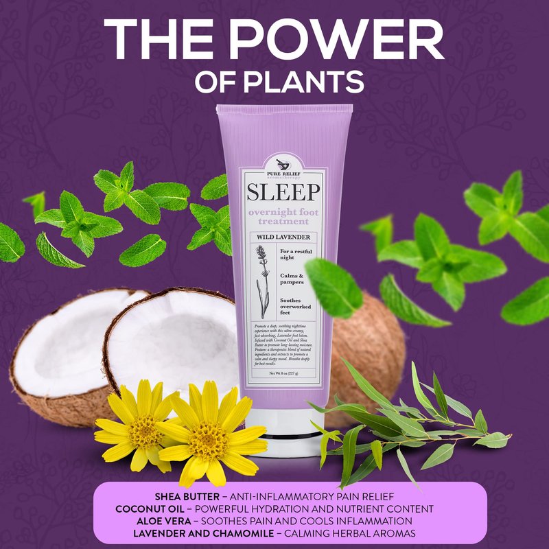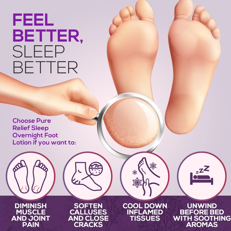 Restore the skin on your feet with 1 lotion from Pure Relief. Your Overnight Foot Lotion helps you soften callused tissue, repair cracked feet, address rashes and irritations, and minimize some of the pain of a long day on your feet. Let the frenzy of the day fall away as you inhale vapors of chamomile and lavender, promoting a smoother pre-bedtime cooldown, and a more restful night.