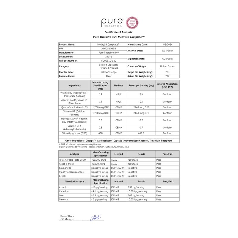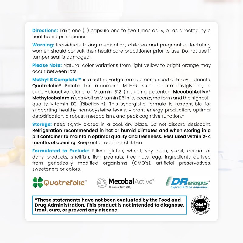 Pure Therapro Rx Methylated B Complex Vitamins Made in USA, 4 Month Supply | Methyl B Complete Quatrefolic 5-MTHF Folate, B12 Methylcobalamin, TMG Trimethylglycine, Methylfolate | Pharm Grade