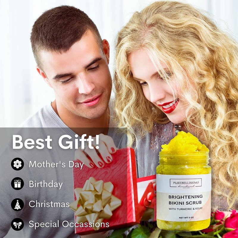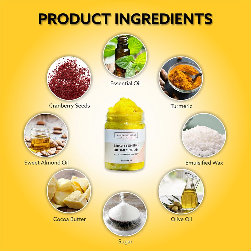 - Fade Away Dark Spots: Do you want to get rid of razor bumps in the bikini area? Our Brightening Bikini Scrub is infused with powerful ingredients such as turmeric and kojic acid, known for their skin brightening properties, to help effectively reduce the appearance of dark spots on your bikini area.