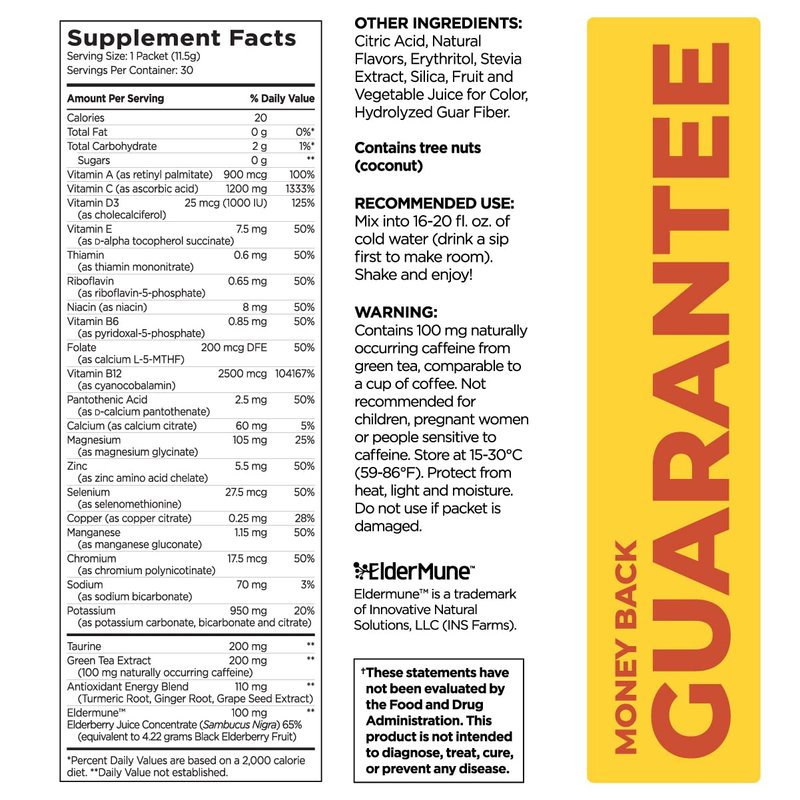 - Boost Your Energy + Immune System. Up to 6 hours of powerful clean, immune boosting energy* now packed with 28 vitamins, minerals and supernutrients like Elderberry, 1200mg of Vitamin C, Vitamin D, Vitamin A, Selenium and Zinc! Powered by natural green tea caffeine and B12 plus contains electrolytes for rapid hydration.